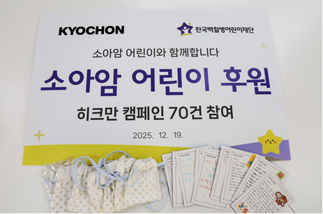 국내 대표 상생 프랜차이즈 교촌치킨을 운영하는 교촌에프앤비㈜는 지난 19일 서울 성북구에 위치한 한국백혈병어린이재단을 찾아 소아암 환아들을 위한 ‘히크만 주머니’와 치킨을 전달했다고 23일 밝혔다.